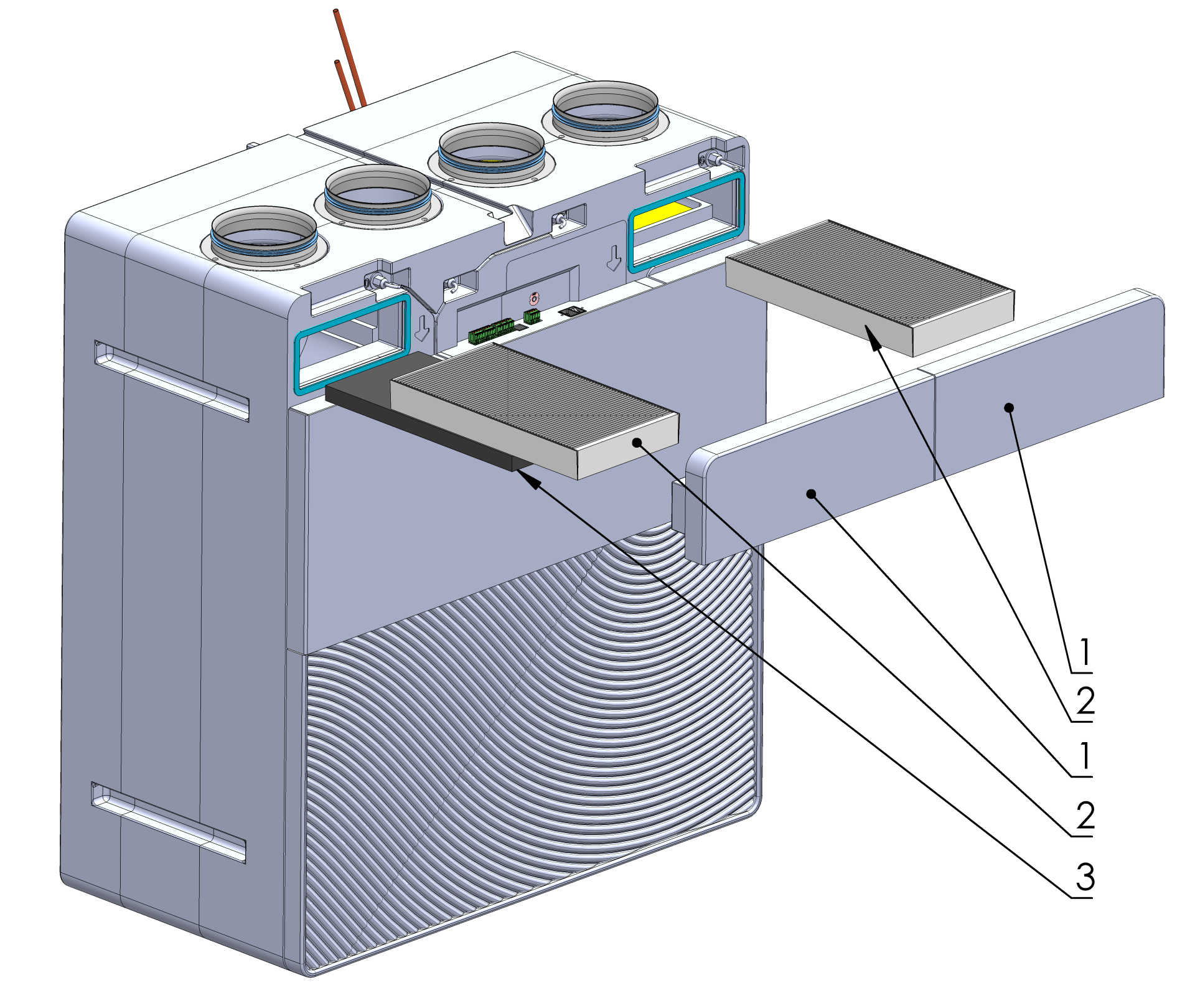 ⚠ Používejte pouze originální filtry dodávané výrobcem. Nepřidávejte žádné vlastní předfiltry, protože by mohly negativně ovlivnit výkon jednotky.